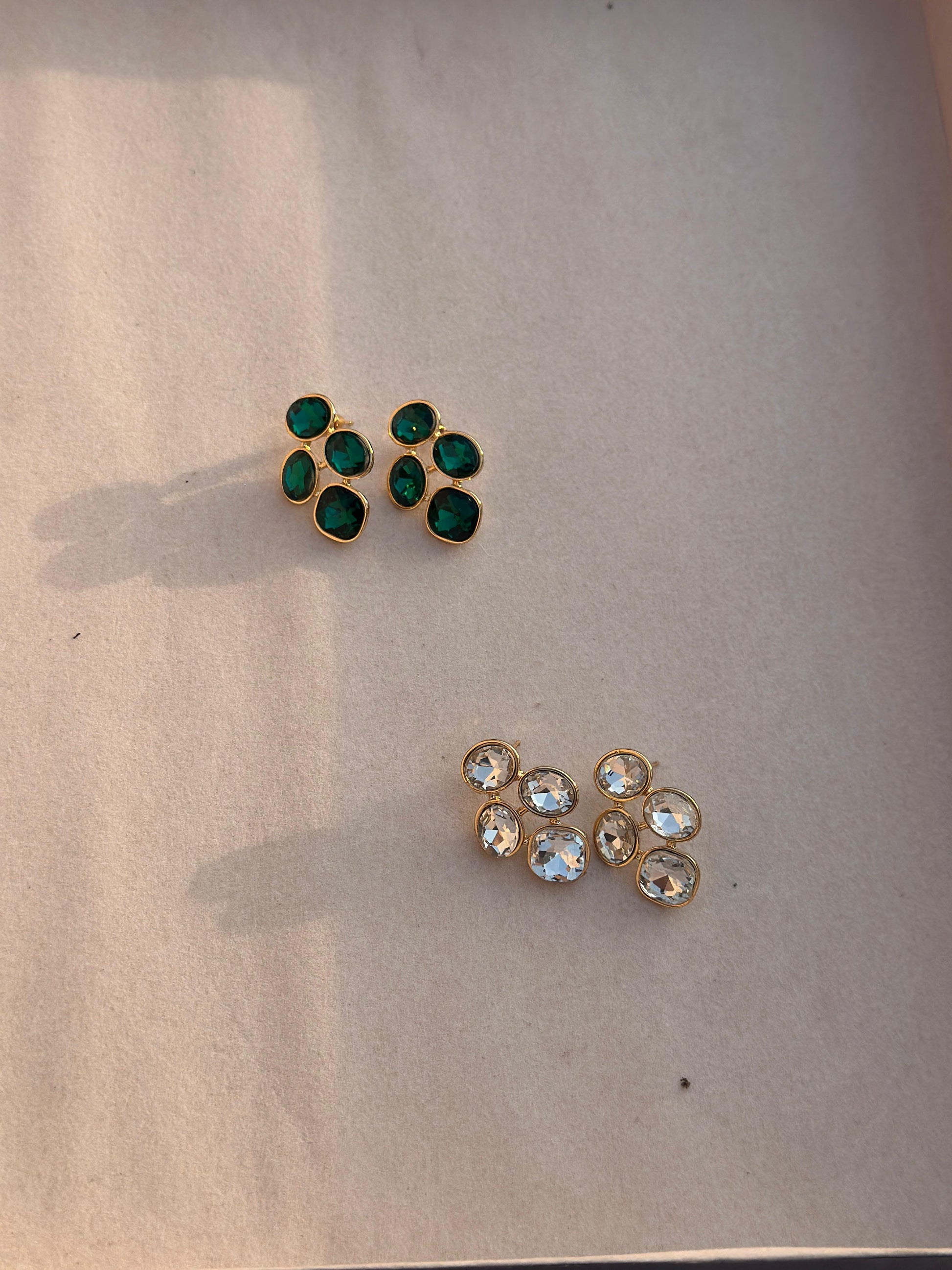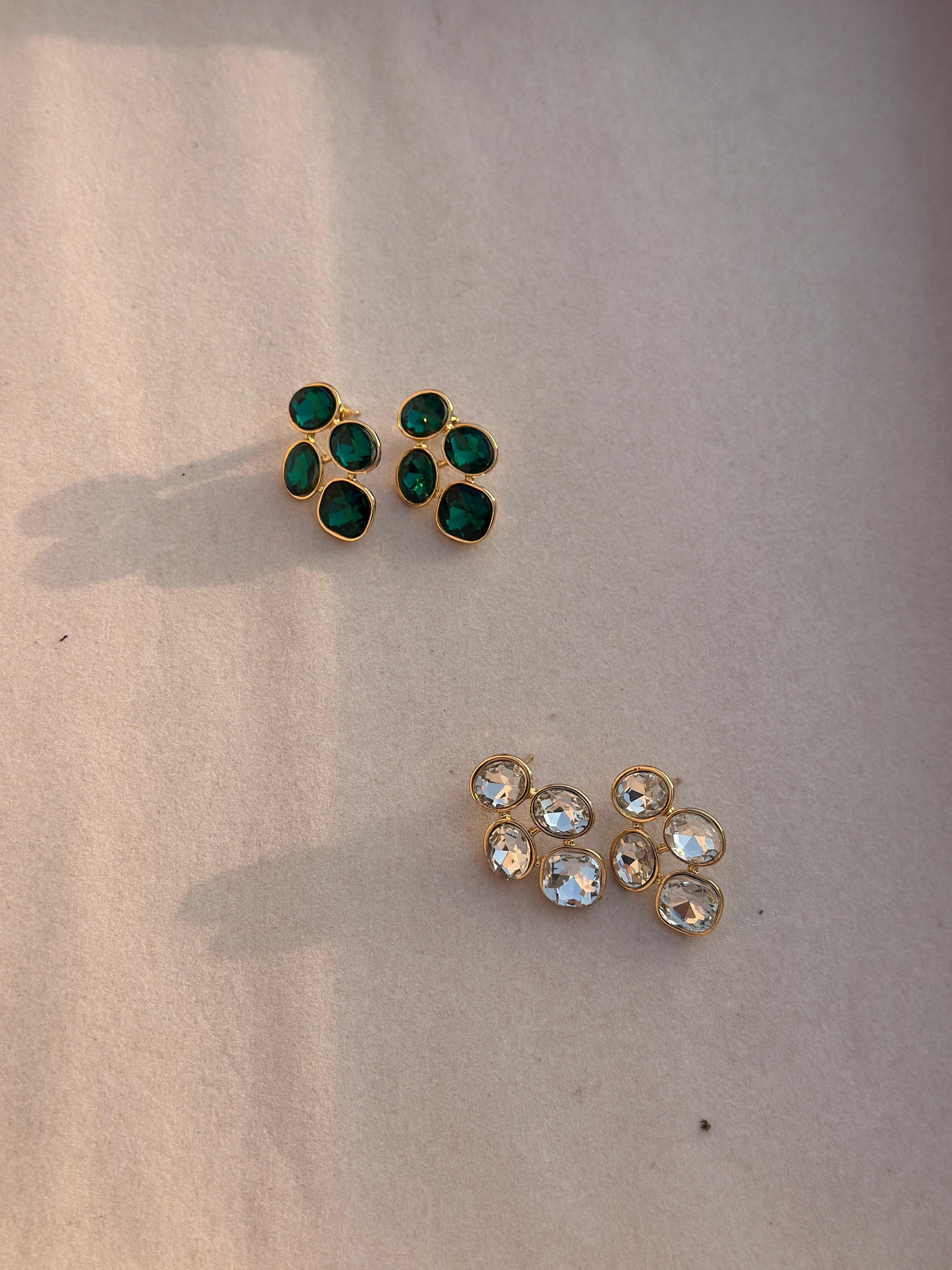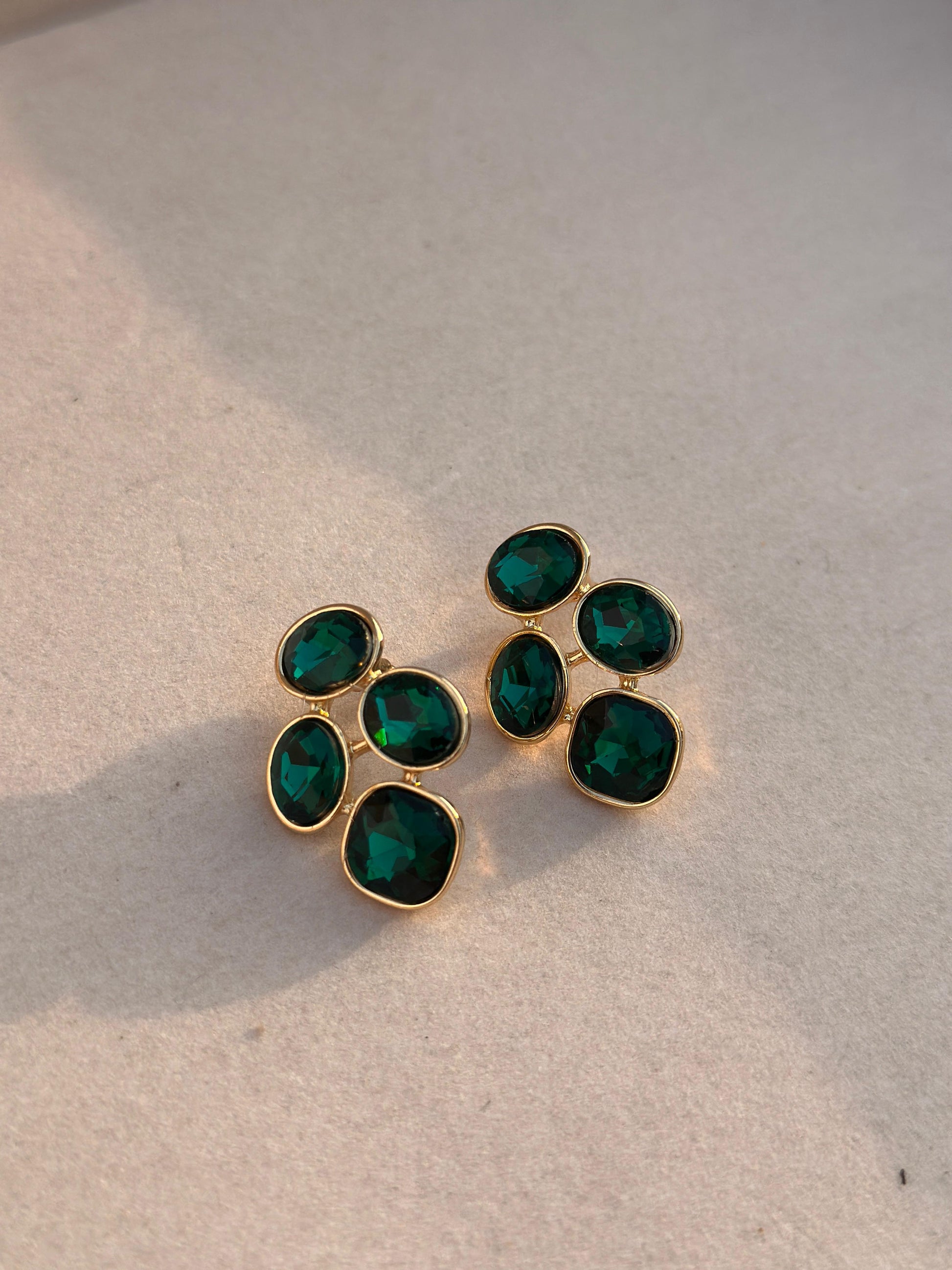 Inspired by floral shapes and rich emerald green stones, these earrings radiate nature’s elegance with a golden touch.