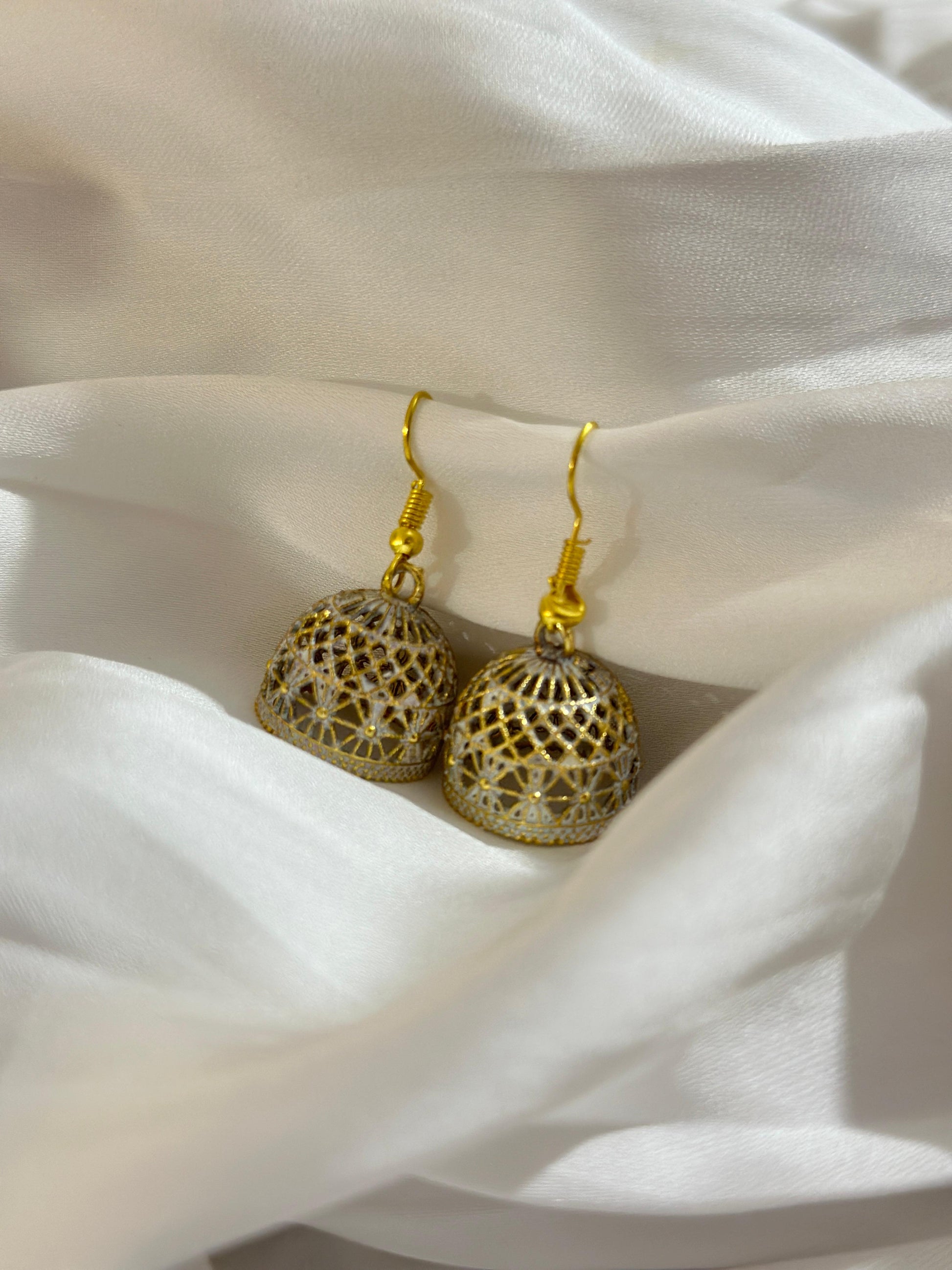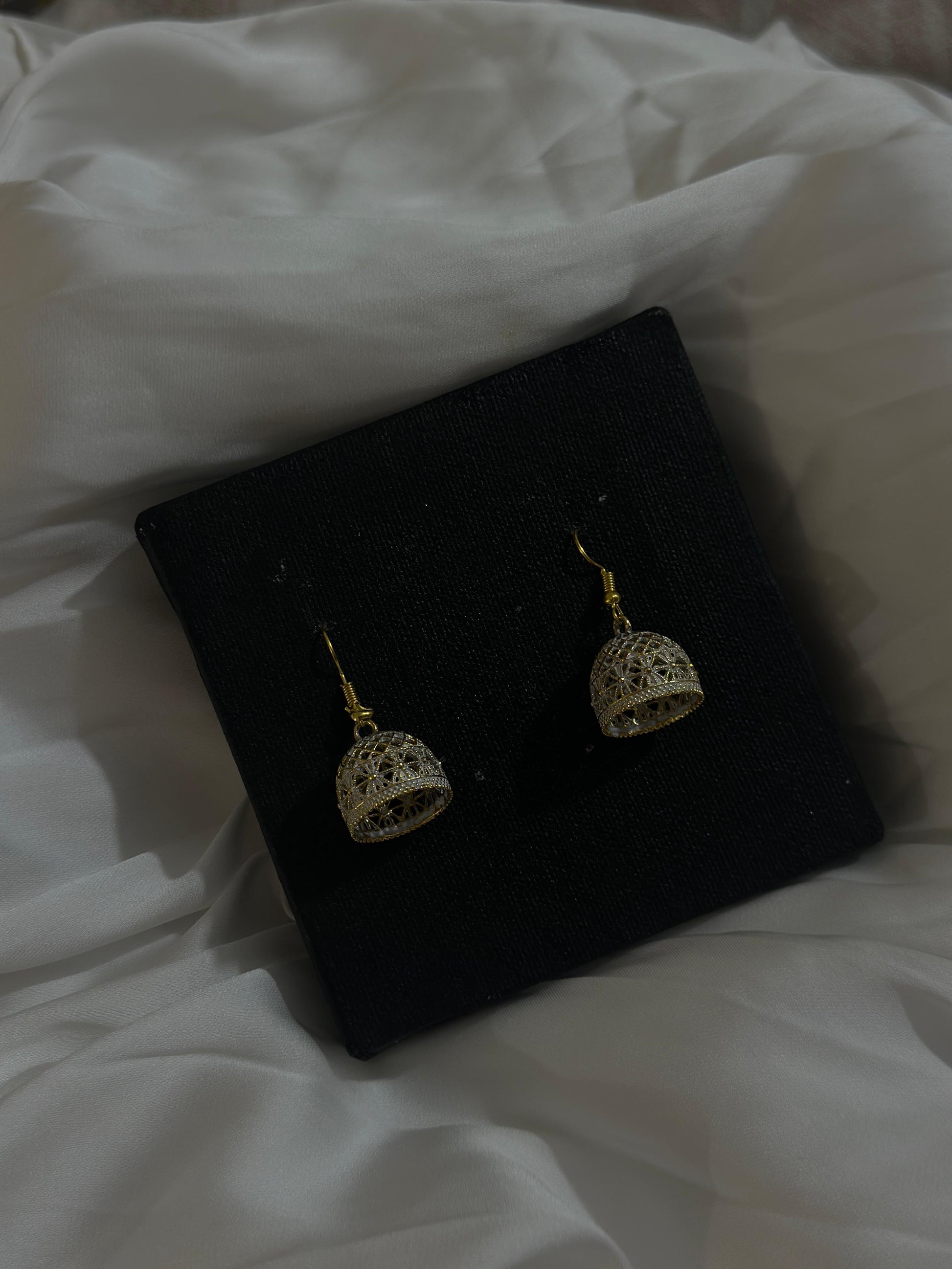 These exquisite golden jhumkas strike the perfect balance between tradition and modern sophistication. Crafted with delicate detailing and a soft golden finish, they feature intricate filigree patterns that shimmer gently in the light. Lightweight and graceful, their subtle golden hue enhances their charm without being overpowering—ideal for both festive occasions and everyday elegance. The classic dome-shaped design pays homage to cultural heritage while offering a timeless accessory for the modern woman.