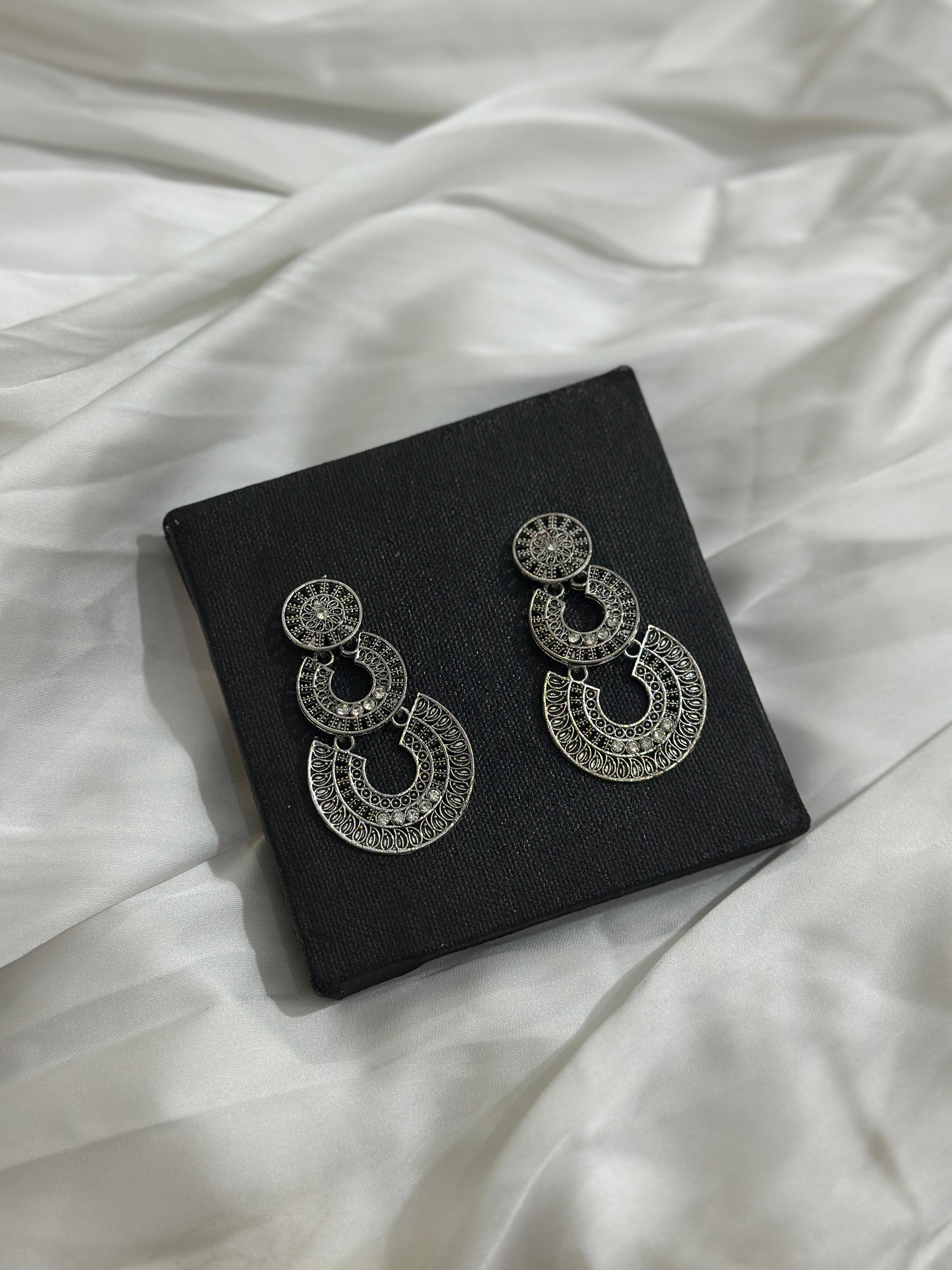 Add a timeless statement to your collection with our Noor Dangle Earrings. These beautifully crafted oxidized silver-tone earrings feature a layered crescent design with intricate filigree detailing, perfect for elevating any outfit.
